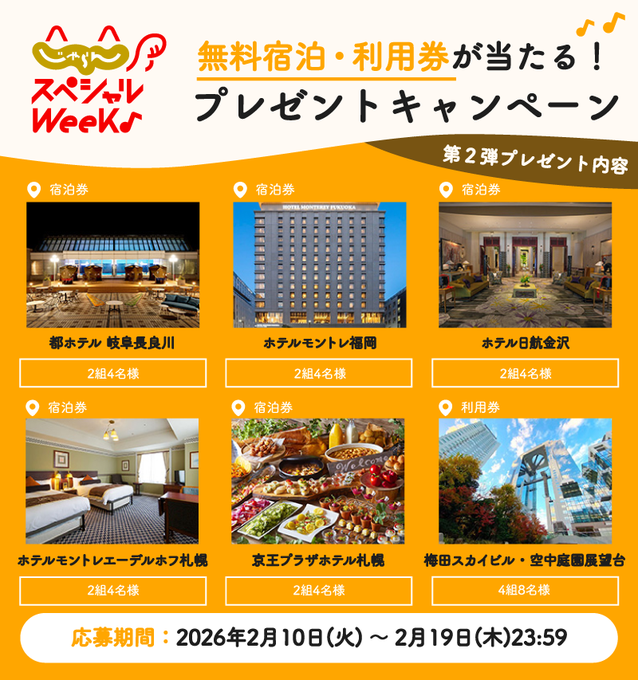 【X懸賞】無料宿泊券・利用券を14組様にプレゼント 2026.02.17じゃらん‐#じゃらんスペシャルウィーク 開催記念 賞品:無料宿泊券・利用券(14組様) 締切:2026年2月19日(木)公式X(Twitter)アカウントをフォロー&キャンペーン対象ポストをリポストしてご応募ください。※詳細はキャンペーンページにてご確認ください。応募はこちらから