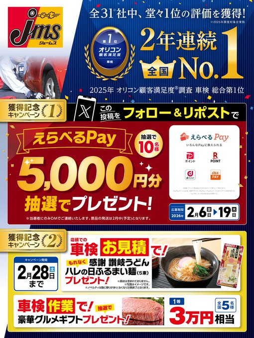 ジェームス車検 2年連続 全国No.1 ありがとうキャンペーン
