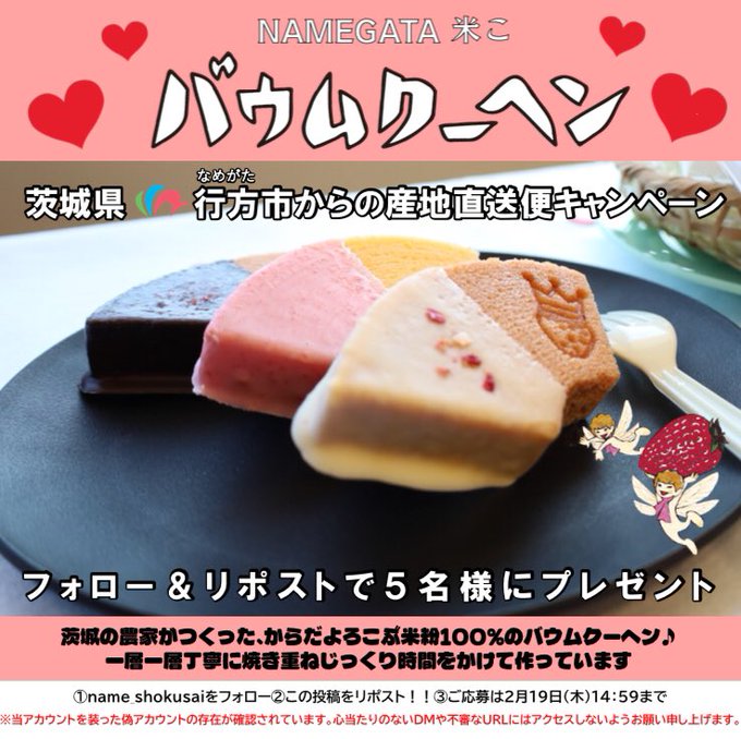 【X・Instagram懸賞】カットバウム10点セットを5名様にプレゼント 2026.02.17なめがたブランド戦略会議‐茨城県行方市からの産地直送便キャンペーン 賞品:からだよろこぶバウムクーヘンの豪華10点セット(5名様) 締切:2026年2月19日(木)14:59公式X(Twitter)アカウントをフォロー&キャンペーン対象ポストをリポストしてご応募ください。Instagramからも応募できます。※詳細はキャンペーンページにてご確認ください。応募はこちらから
