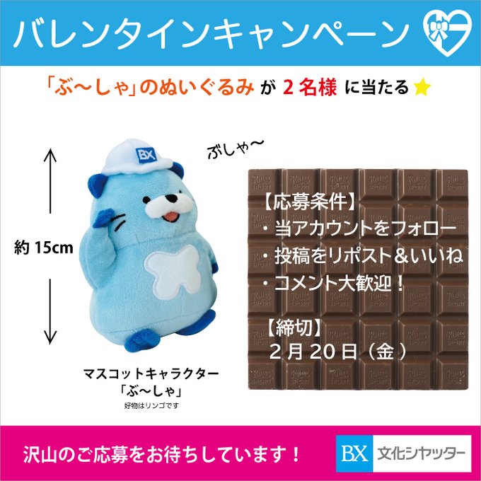 【X懸賞】ぶ~しゃのぬいぐるみを2名様にプレゼント 2026.02.18文化シヤッター株式会社‐バレンタインキャンペーン 賞品:ぶ~しゃのぬいぐるみ(2名様) 締切:2026年2月20日(金)公式X(Twitter)アカウントをフォロー&キャンペーン対象ポストをリポストしてご応募ください。※詳細はキャンペーンページにてご確認ください。応募はこちらから