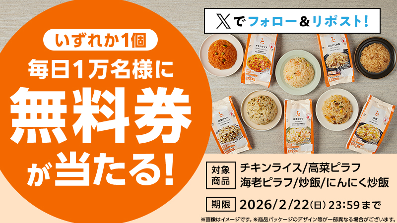賞品:「ローソンオリジナル冷凍米飯 チキンライス・高菜ピラフ・海老ピラフ・炒飯・にんにく炒飯」無料券(合計5万名様)