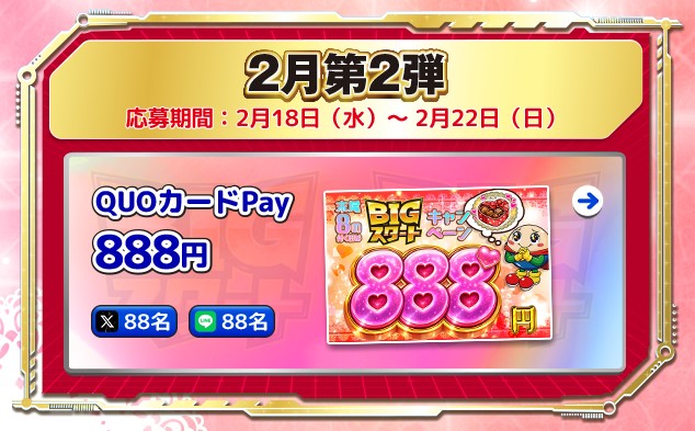 【X・LINE懸賞】QUOカードPay888円分を176名様にプレゼント 2026.02.18藤商事‐BIGスタートプレゼントキャンペーン 賞品:QUOカードPay888円分(176名様) 締切:2026年2月22日(日)応募方法 LINE友だちになる リッチメニューをタップ 欲しい景品をタップ※詳細はキャンペーンページにてご確認ください。応募はこちらから