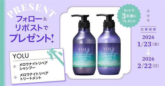 賞品:YOLU「メロウナイトリペアシャンプー・トリートメント(3名様)