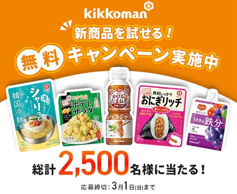 キッコーマングループの新商品いずれか1品を2,500名様にプレゼント 2026.02.19キッコーマン 新商品モニターキャンペーン 賞品:キッコーマングループの新商品いずれか1品(2,500名様) 締切:2026年3月1日(日)ご応募には会員登録/ログインが必要です。※詳細はキャンペーンページにてご確認ください。応募はこちらから