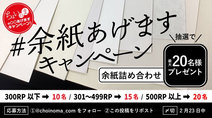 【X懸賞】余紙詰め合わせを20名様にプレゼント 2026.02.20印刷通販ちょいのま‐ちょいのまの〇〇あげますキャンペーン 賞品:余紙詰合わせ(20名様) 締切:2026年2月23日(月)公式X(Twitter)アカウントをフォロー&キャンペーン対象ポストをリポストしてご応募ください。※詳細はキャンペーンページにてご確認ください。応募はこちらから