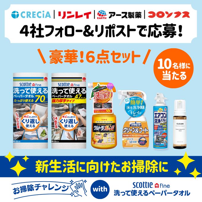 【X懸賞】賞品6点セットを10名様にプレゼント 2026.02.20クレシア‐プレゼントキャンペーン 賞品:賞品6点セット(10名様) 締切:2026年2月23日(月)4社をフォロー&キャンペーン対象ポストをリポストしてご応募ください。※詳細はキャンペーンページにてご確認ください。応募はこちらから