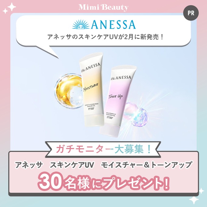 【X懸賞】アネッサ スキンケアUV モイスチャー&トーンアップを30名様にプレゼント 2026.02.20Mimi Beauty‐ガチモニター企画 賞品:アネッサ スキンケアUV モイスチャー&トーンアップ(30名様) 締切:2026年2月23日(月)応募条件 ・商品体験頂ける方 ・公開のXアカウントをお持ちの方※詳細はキャンペーンページにてご確認ください。応募はこちらから