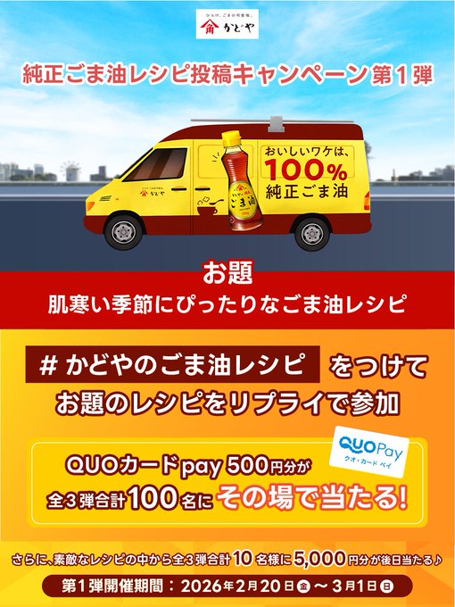 かどや製油‐かどやのごまたび 実施記念 純正ごま油レシピ投稿キャンペーン