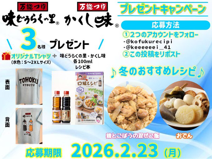 賞品:オリジナルTシャツ(水色:サイズS〜2XL)&味どうらくの里・かくし味100ml +レシピ本(3名様)