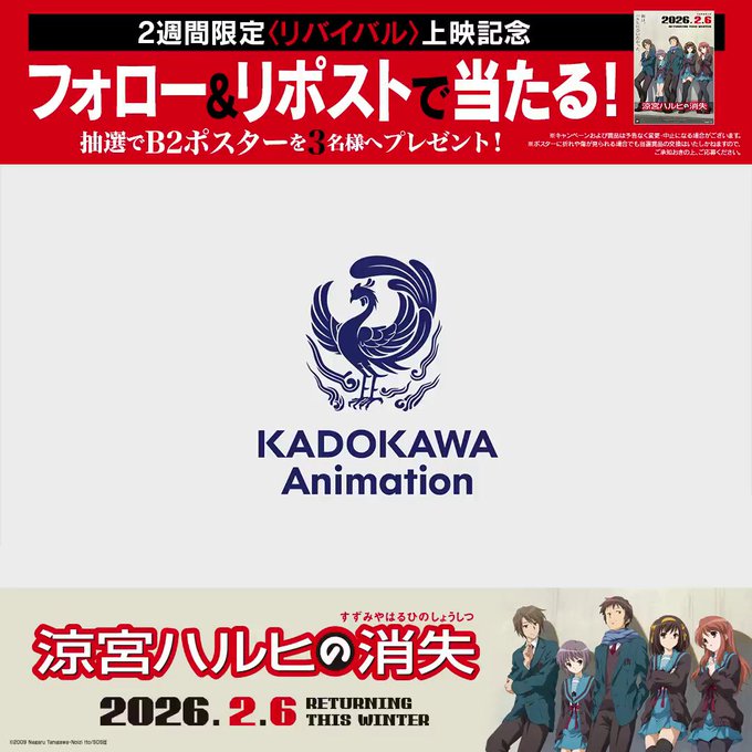 【X懸賞】劇場版『涼宮ハルヒの消失』B2ポスターを3名様にプレゼント 2026.02.21ティ・ジョイ‐フォロー&リポストキャンペーン 賞品:B2ポスター(3名様) 締切:2026年2月23日(月)公式X(Twitter)アカウントをフォロー&キャンペーン対象ポストをリポストしてご応募ください。※詳細はキャンペーンページにてご確認ください。応募はこちらから