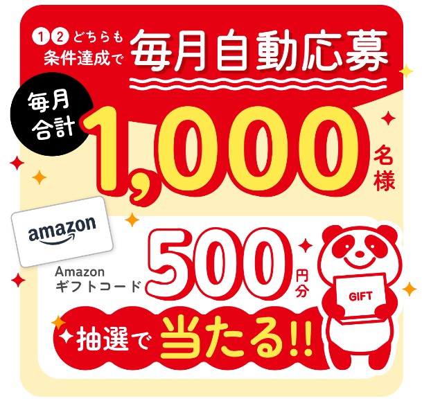 条件達成で!毎月1,000名様にAmazonギフトコード500円分が抽選で当たる!