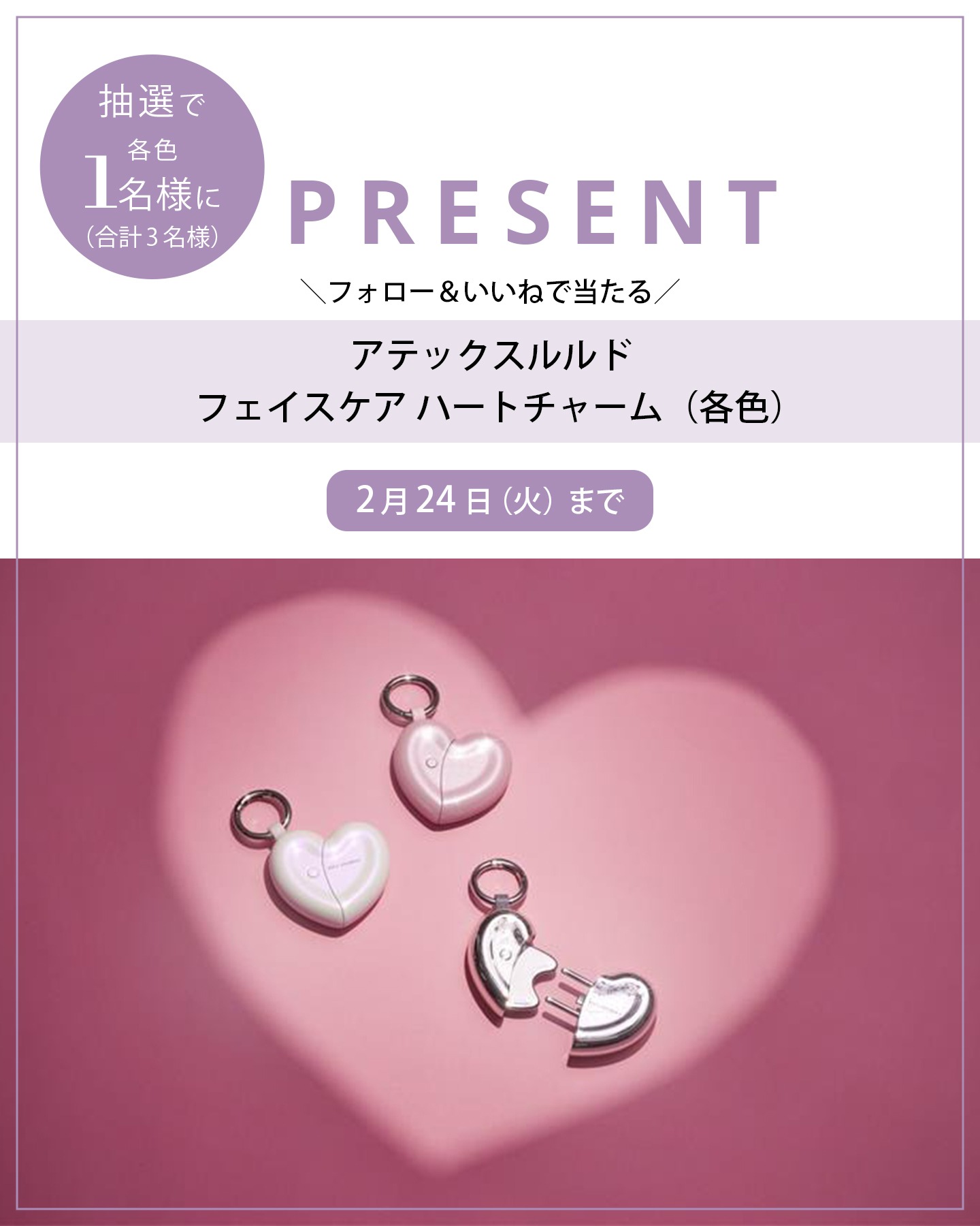 賞品:アテックスルルド「フェイスケア ハートチャーム(オーロラホワイト・グリッターピンク・メタリックシルバー)」(3名様)