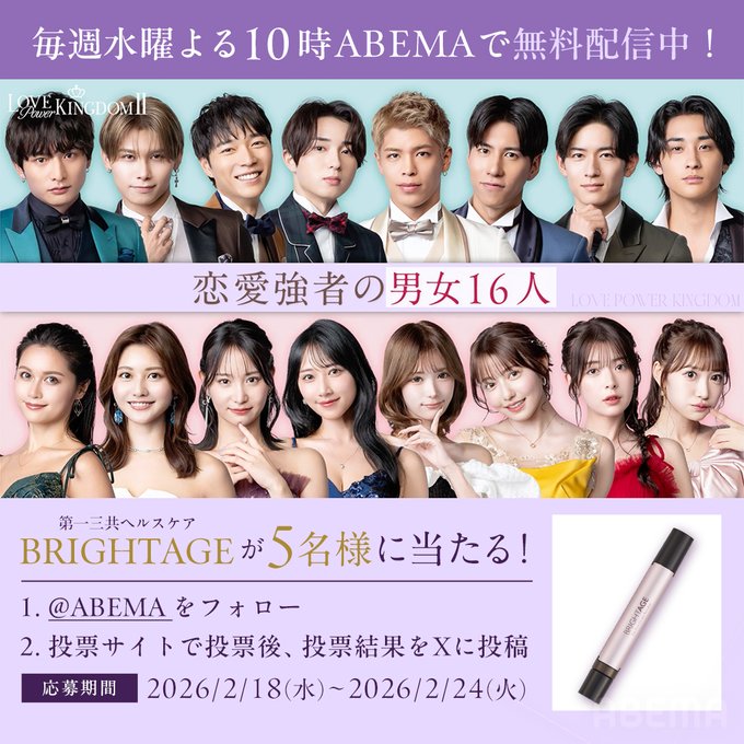 【X懸賞】第一三共ヘルスケア BRIGHTAGEを5名様にプレゼント 2026.02.22ABEMA(アベマ)‐#ラブパワーキングダム 2 プレゼントキャンペーン 視聴者モテVOTE 賞品:BRIGHTAGE(5名様) 締切:2026年2月24日(火)推しメンに投票して プレゼントをゲットしよう🎁※詳細はキャンペーンページにてご確認ください。応募はこちらから
