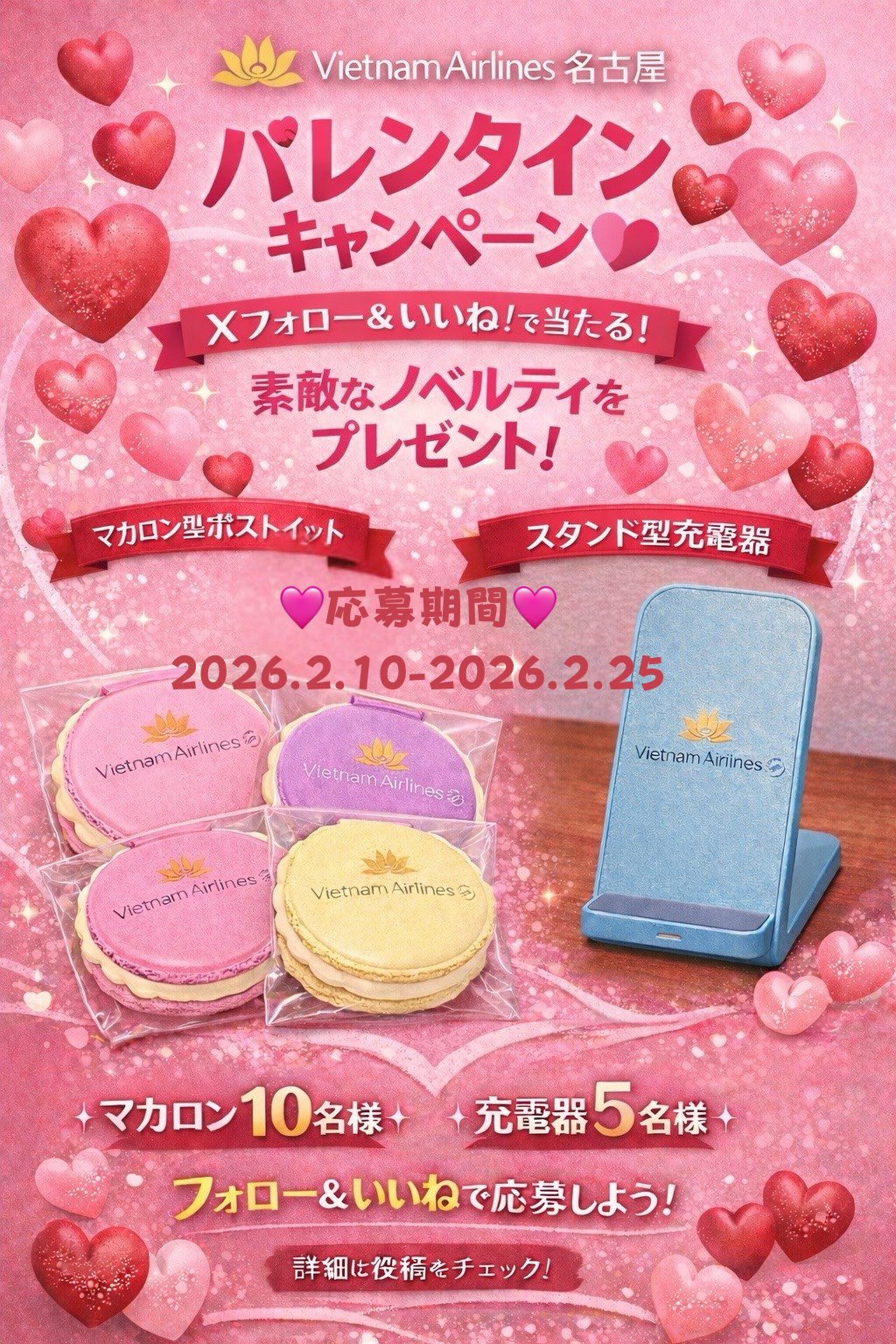 【X懸賞】マカロン型付箋、デスク型充電器を合計15名様にプレゼント 2026.02.23ベトナム航空 名古屋支店‐バレンタインキャンペーン 賞品:マカロン型付箋、デスク型充電器(合計15名様) 締切:2026年2月25日(水)フォロー&いいね👍で応募完了💕※詳細はキャンペーンページにてご確認ください。応募はこちらから