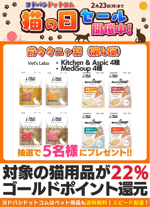 【X懸賞】Vet’s Labo キャットフード8種を5名様にプレゼント 2026.02.23ヨドバシ@日用品専門‐プレゼントキャンペーン 賞品:Vet’s Labo キャットフード8種(5名様) 締切:2026年2月25日(水)👉フォロー&リポスト👉猫さんたちに伝えたいことは?✍️※詳細はキャンペーンページにてご確認ください。応募はこちらから