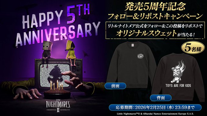 【X懸賞】オリジナルスウェットを5名様にプレゼント 2026.02.23#リトルナイトメア2 5周年記念キャンペーン 賞品:オリジナルスウェット(5名様) 締切:2026年2月25日(水)公式X(Twitter)アカウントをフォロー&キャンペーン対象ポストをリポストしてご応募ください。※詳細はキャンペーンページにてご確認ください。応募はこちらから
