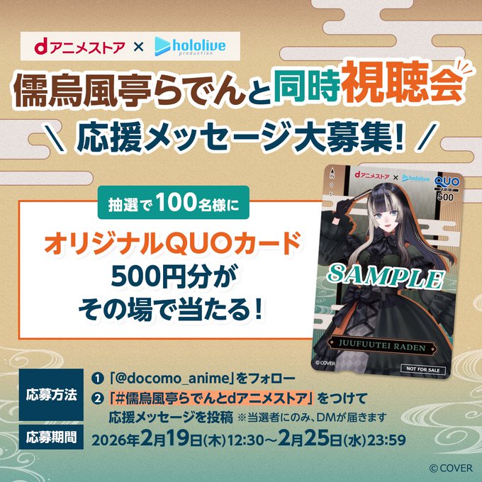 【X懸賞】オリジナルQUOカード500円分が100名様にその場で当たる! 2026.02.23dアニメストア‐儒烏風亭らでんさんへの応援メッセージ募集キャンペーン 賞品:オリジナルQUOカード(100名様) 締切:2026年2月25日(水)投稿してくれた人の中から抽選で オリジナルQUOカードをプレゼント🎁※詳細はキャンペーンページにてご確認ください。応募はこちらから