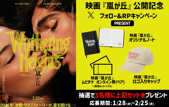 賞品:映画『嵐が丘』オンラインムビチケ(ペア)&オリジナルノート&ロゴ入りキャップ(3名様)
