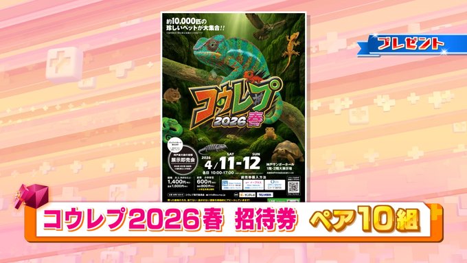 賞品:神戸サンボーホールで開かれる爬虫類など1万匹のペットが集まるイベント「コウレプ」の ペア招待券(10組様)