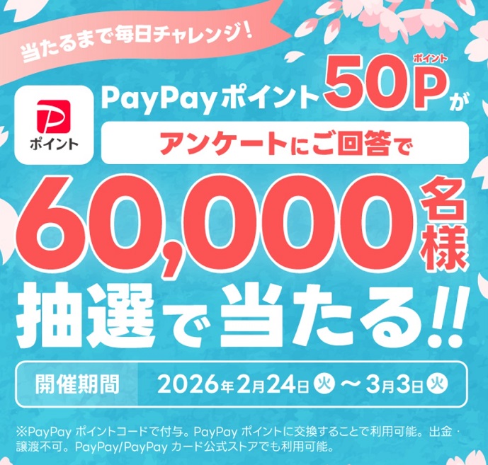 賞品:PayPayポイント50ポイント(最大60,000名様)