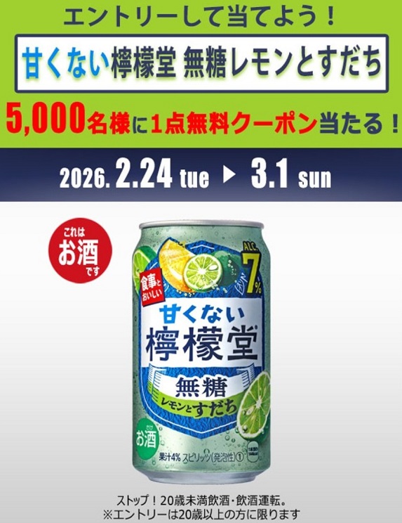 賞品:甘くない檸檬堂 無糖レモンとすだち 350ml 無料クーポン(5,000名様)