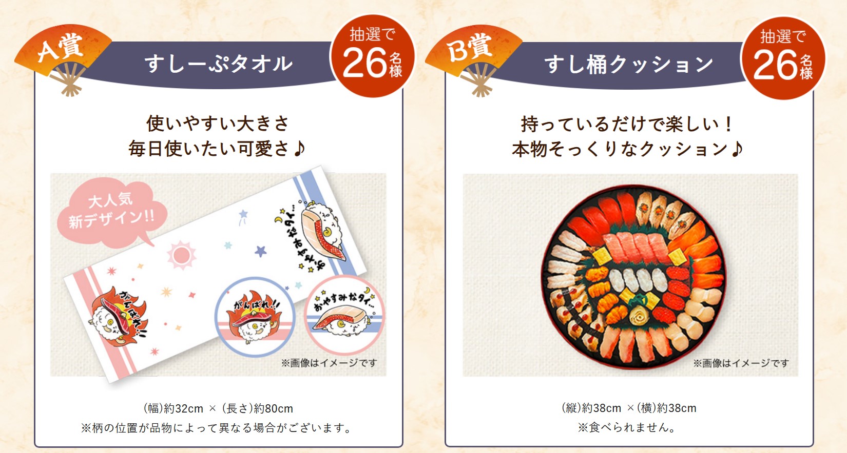 すしーぷタオル、すし桶クッションを合計52名様にプレゼント 2026.02.24宅配寿司銀のさら‐創業祭プレゼントキャンペーン 賞品: A:すしーぷタオル(26名様) B:すし桶クッション(26名様) 締切:2026年3月31日(火)ご応募には会員登録/ログインが必要です。※詳細はキャンペーンページにてご確認ください。応募はこちらから