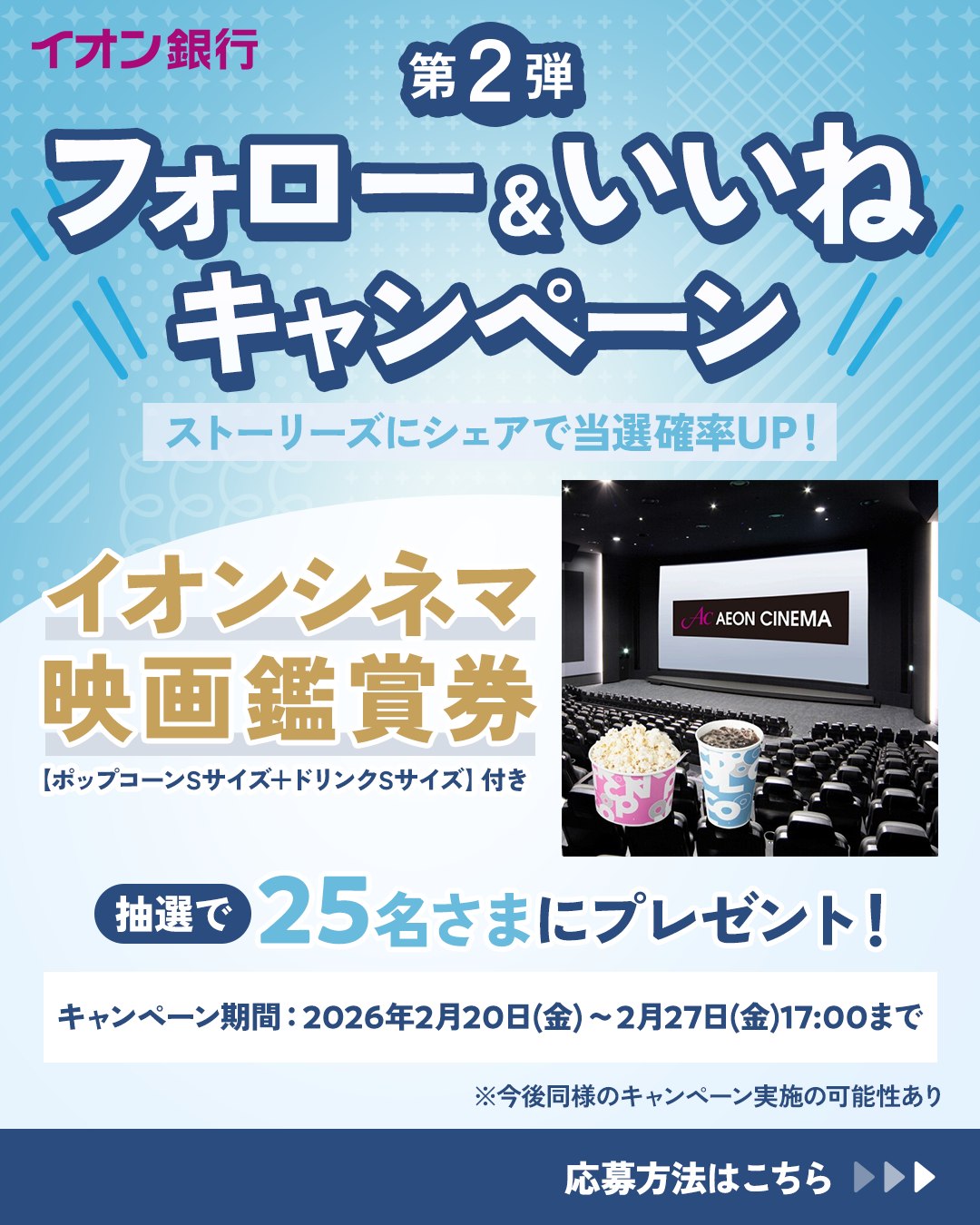 賞品:イオンシネマ映画鑑賞券 ポップコーンSサイズ+ドリンクSサイズ 付き(25名様)
