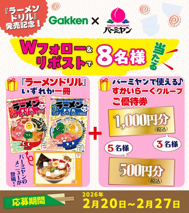 @gakkenyoujiworkと@bamiyan_CPをフォロー&キャンペーン対象ポストをリポストしてご応募ください。
