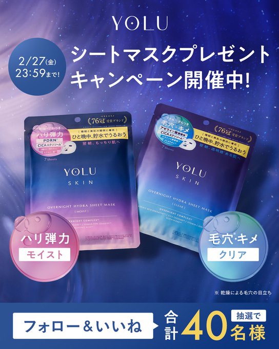 【X懸賞】YOLU オーバーナイトハイドラシートマスクを40名様にプレゼント 2026.02.25and Habit‐フォロー&いいねするだけ!YOLU シートマスクプレゼントキャンペーン 賞品:YOLU オーバーナイトハイドラシートマスク(40名様) 締切:2026年2月27日(金)①@and_habitをフォロー ②投稿にいいね※詳細はキャンペーンページにてご確認ください。応募はこちらから