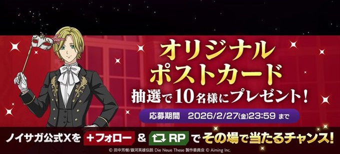 銀河英雄伝説 Die Neue Saga公式X(Twitter)アカウントをフォロー&キャンペーン対象ポストをリポストして、記載されているURLからご応募ください。