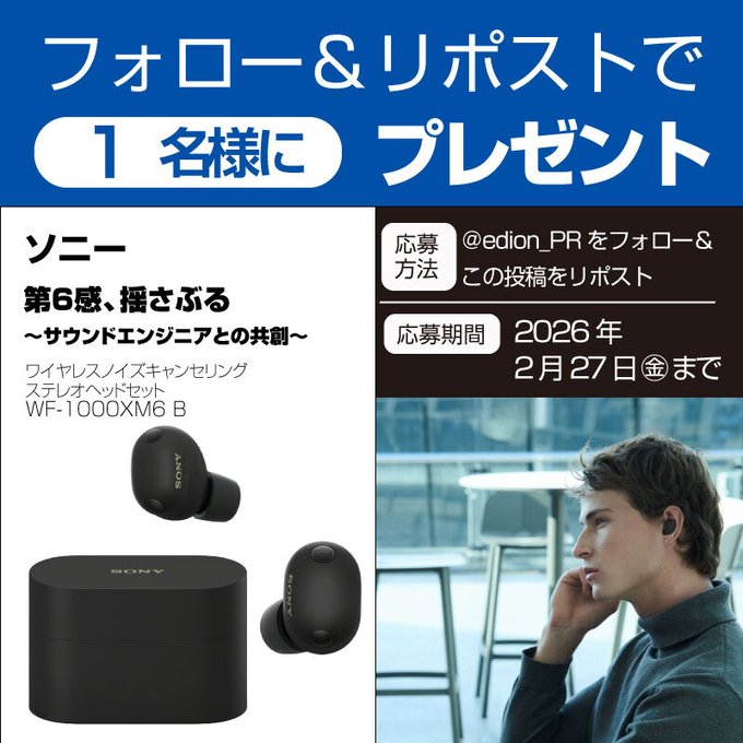 賞品:ソニー WF-1000XM6 完全ワイヤレスイヤホン(1名様)