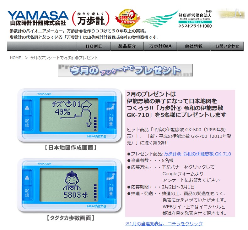 万歩計® 令和の伊能忠敬 GK-710を5名様にプレゼント 2026.02.25万歩計®の山佐(ヤマサ YAMASA)‐プレゼントキャンペーン 賞品:万歩計® 令和の伊能忠敬 GK-710(5名様) 締切:2026年3月1日(日)アンケートに答えてご応募ください。※詳細はキャンペーンページにてご確認ください。応募はこちらから