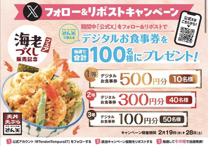 天丼・天ぷら本舗 さん天公式X(Twitter)アカウントをフォロー&キャンペーン対象ポストをリポストして、記載されているURLからご応募ください。