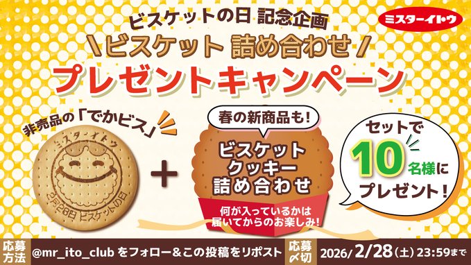 賞品:非売品の「でかビス」と、春の新商品を含むイトウ製菓のクッキー詰め合わせ(10名様)