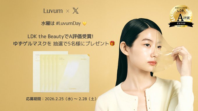 【X懸賞】ゆずゲルマスクを5名様にプレゼント 2026.02.26Luvum_japan‐プレゼントキャンペーン 賞品:ゆずゲルマスク(5名様) 締切:2026年2月28日(土)① @LuvumJapan をフォロー ② 投稿をリポスト ③ #Luvum をつけてコメント※詳細はキャンペーンページにてご確認ください。応募はこちらから