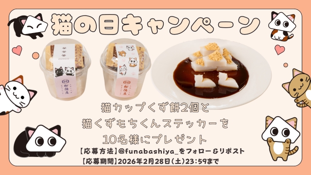 賞品:猫型のくず餅が入った猫カップくず餅2個&猫くずもちくんステッカー(10名様)