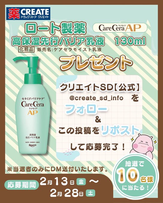 【X懸賞】ロート製薬 ケアセラAP高保湿先行バリア乳液を10名様にプレゼント