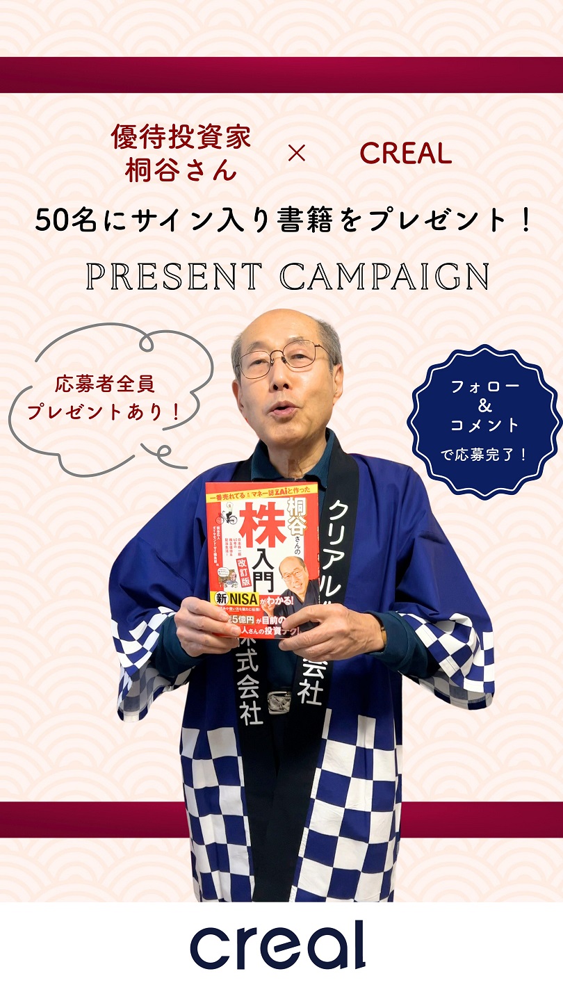【X・Instagram懸賞】桐谷さんサイン入り著書「桐谷さんの株入門」を50名様にプレゼント 2026.02.26CREAL‐プレゼントキャンペーン 賞品:桐谷さんサイン入り著書「桐谷さんの株入門」(50名様) 締切:2026年2月28日(土)【応募方法】 1⃣@CREALjp をフォロー 2⃣コメントで応募Instagramからも応募できます。※詳細はキャンペーンページにてご確認ください。応募はこちらから