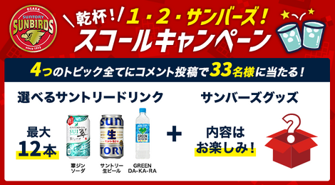 期間中、4つの対象トピック全てにコメントを投稿していただいた方の中から合計33名様に、応援がもっと盛り上がる「選べるサントリードリンク+サンバーズグッズ」をプレゼント!