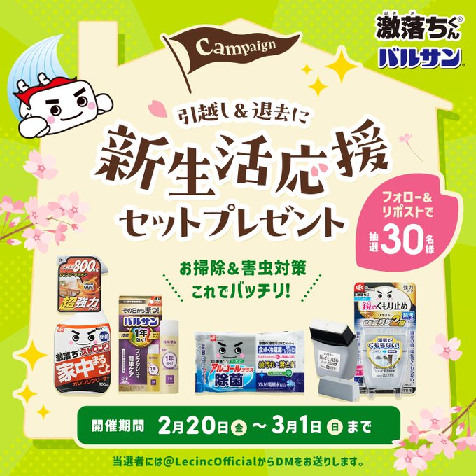 【X懸賞】新生活にオススメの商品を30名様にプレゼント 2026.02.27レック株式会社‐退去&新生活キャンペーン 賞品:新生活にオススメの商品(30名様) 締切:2026年3月1日(日)公式X(Twitter)アカウントをフォロー&キャンペーン対象ポストをリポストしてご応募ください。※詳細はキャンペーンページにてご確認ください。応募はこちらから