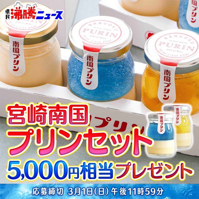 【X懸賞】宮崎南国プリンセットを5名様にプレゼント 2026.02.27旬感LIVEとれたてっ!‐#沸騰ニュースプレゼント 賞品:宮崎南国プリンセット(5名様) 締切:2026年3月1日(日)応募方法 ①番組公式Xをフォロー ②投稿をリプライまたは引用リポスト※詳細はキャンペーンページにてご確認ください。応募はこちらから