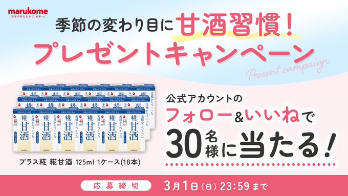 【X懸賞】プラス糀 糀甘酒 125ml 1ケースを30名様にプレゼント 2026.02.27マルコメ‐季節の変わり目に甘酒習慣!プレゼントキャンペーン 賞品:プラス糀 糀甘酒LL 125ml 1ケース(30名様) 締切:2026年3月1日(日)フォロー&いいねで当たる!※詳細はキャンペーンページにてご確認ください。応募はこちらから