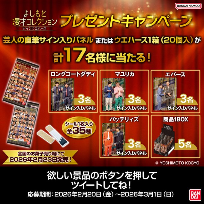 賞品:芸人の直筆サイン入りパネル、ウエハース1箱(合計17名様)