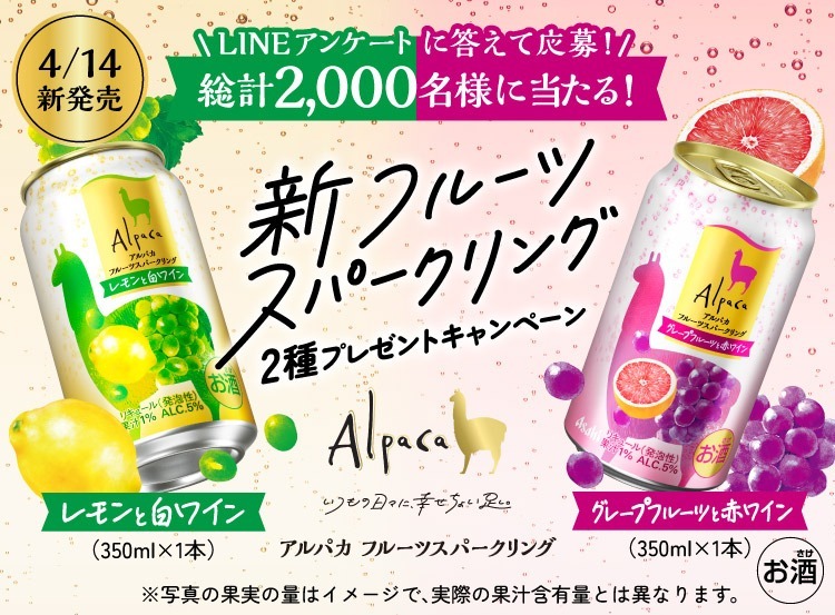アンケートに答えると「アルパカフルーツスパークリング2本セット」が抽選で2,000名に当たる!