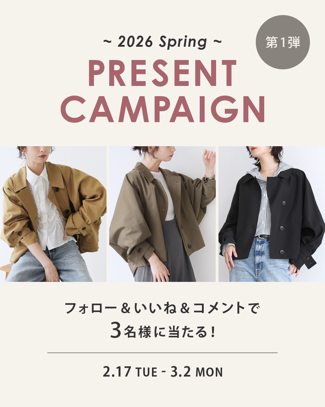 賞品:トレンチ風ショート丈ドルマンコート(3名様)
