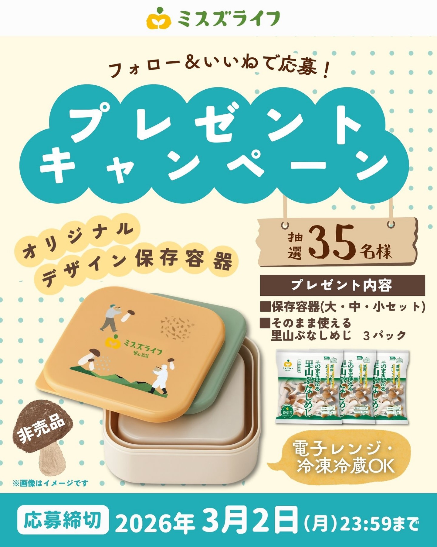賞品:オリジナル保存容器&そのまま使える里山ぶなしめじのセット(35名様)