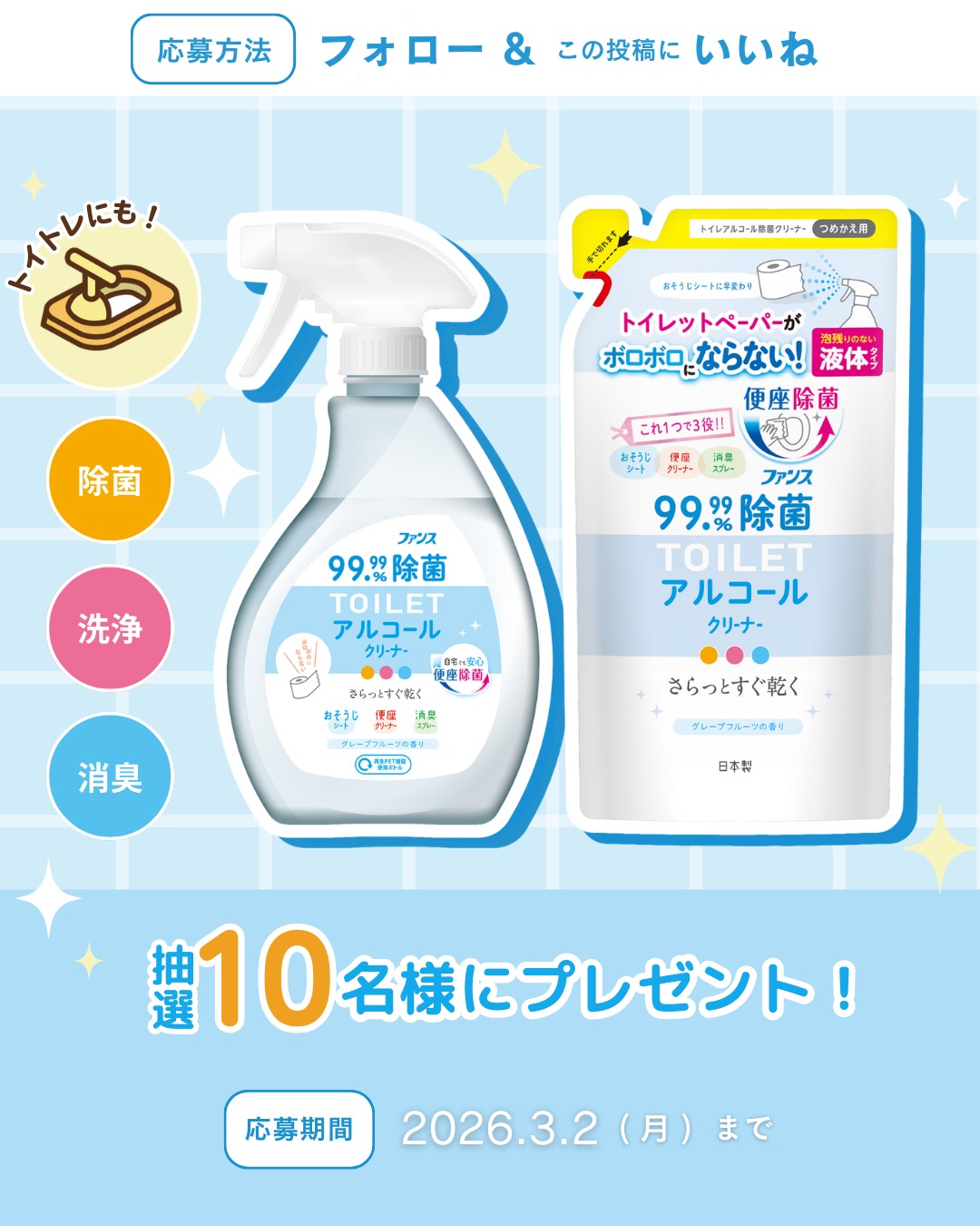 賞品:ファンス トイレ用アルコール除菌クリーナーの本体と詰替をセット(10名様)