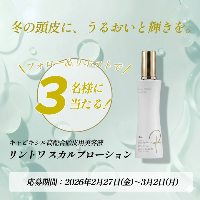 【X懸賞】リントワ スカルプローションを3名様にプレゼント 2026.02.28リントワ‐プレゼントキャンペーン 賞品:リントワ スカルプローション(3名様) 締切:2026年3月2日(月)応募方法 1⃣ @Rintor_officialをフォロー 2⃣ 投稿をいいね❤リポスト※詳細はキャンペーンページにてご確認ください。応募はこちらから
