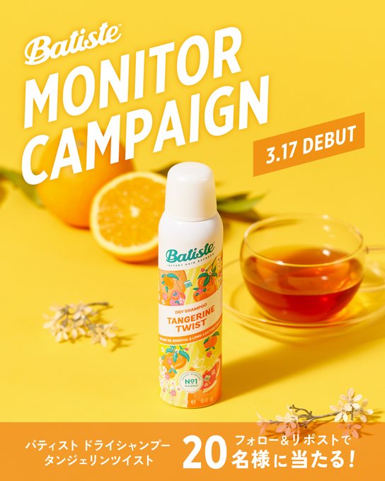 【X・Instagram懸賞】バティスト ドライシャンプー タンジェリンツイストを20名様にプレゼント 2026.02.28バティスト ドライシャンプー タンジェリンツイスト モニター募集 賞品:バティスト ドライシャンプー タンジェリンツイスト(20名様) 締切:2026年3月2日(月)公式X(Twitter)アカウントをフォロー&キャンペーン対象ポストをリポストしてご応募ください。Instagramからも応募できます。※詳細はキャンペーンページにてご確認ください。応募はこちらから