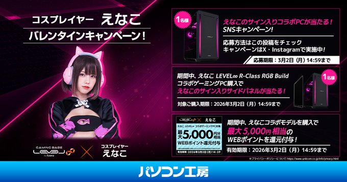 【X・Instagram懸賞】えなこのサイン入りコラボPCを1名様にプレゼント 2026.02.28LEVEL ∞(インフィニティ)‐「えなこ」バレンタインキャンペーン 賞品:えなこのサイン入りコラボPC(1名様) 締切:2026年3月2日(月)14:59応募方法 ① @enako_cos と @LEVEL_INF をフォロー ② 投稿に #えなこxレベルインフィニティ を付けて引用ポストInstagramからも応募できます。※詳細はキャンペーンページにてご確認ください。応募はこちらから